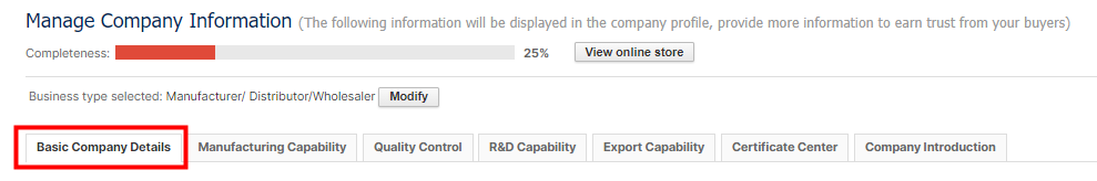 Basic Company Detailsでは、住所、取り扱い製品など基本情報を入力します。