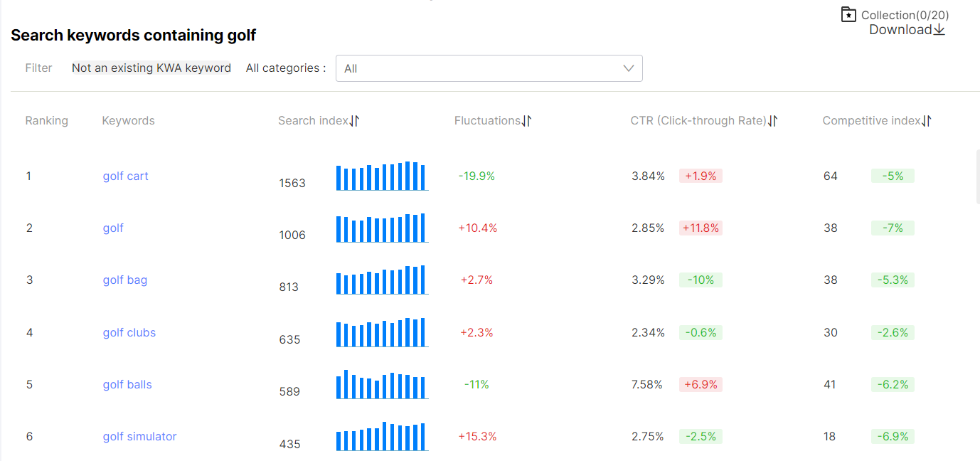 項目 説明 Ranking ランキング Keywords キーワード Search index キーワード検索ボリューム Fluctuations 検索ボリュームの増減率 CTR (Click-through Rate) 検索結果から会社情報ページや製品情報ページがクリックされた割合 Competitive index キーワードを使用している企業数。数字が大きければ競合度が高いキーワードと判断します。