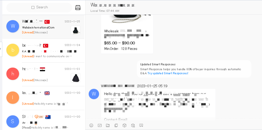 - バイヤー名をクリックすると、画面中央にメッセージ内容の詳細が表示されます。