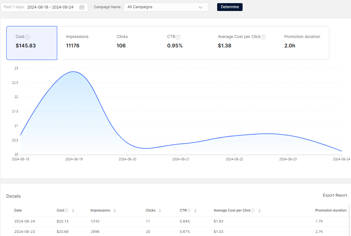 Campaign Reportでは、各広告キャンペーンのパフォーマンスを確認できます。