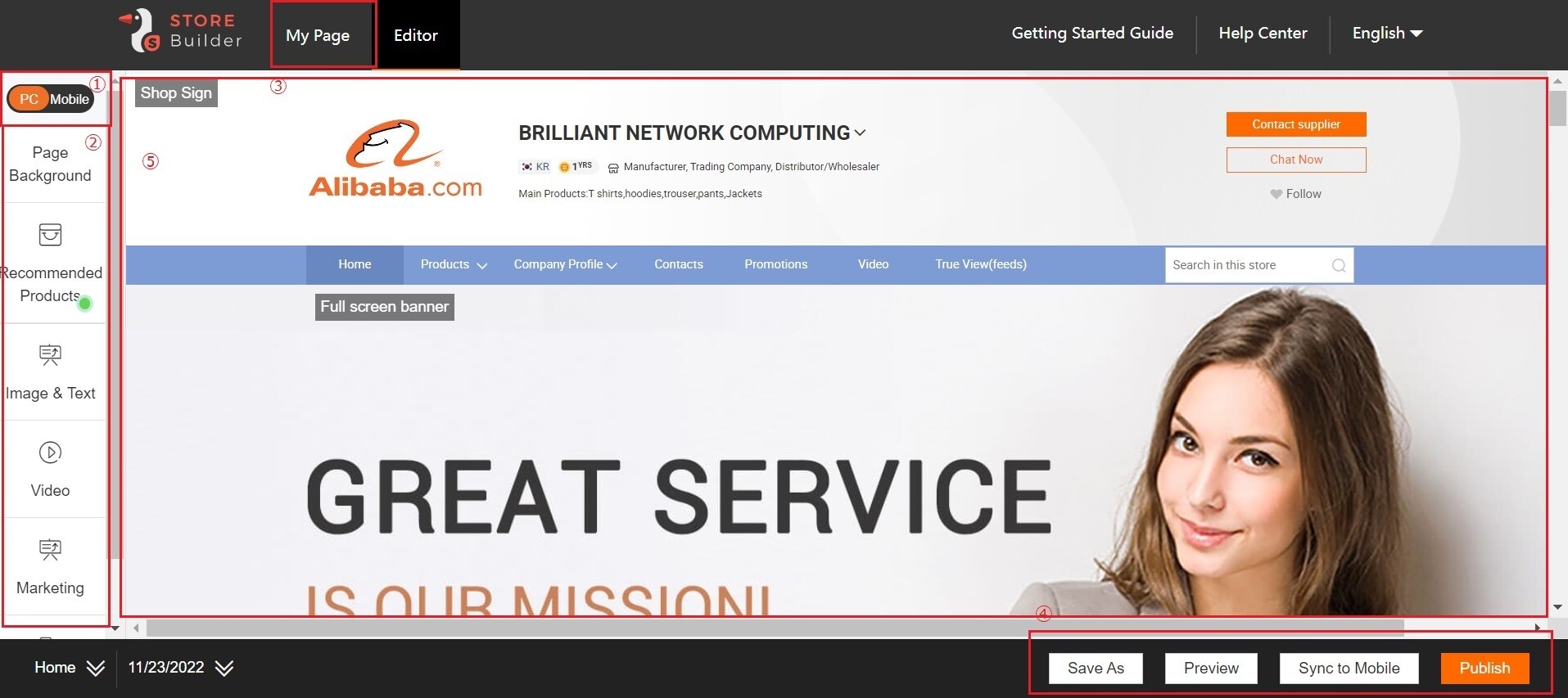 Store(ストアページ)とは、貴社の紹介や製品情報などを掲載できる Alibaba.com 内での貴社専用ページです。 各パーツの色を変更したり、画像をアップロード、モジュール追加して、貴社オリジナルのストアデザインを作成できます。