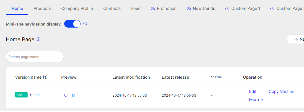 - Mini-site navigation displayを[On]にします。ストアトップページのデザインを作成することができます。Onにしていない場合は、掲載済み製品一覧が貴社ストアページのトップに表示されます。