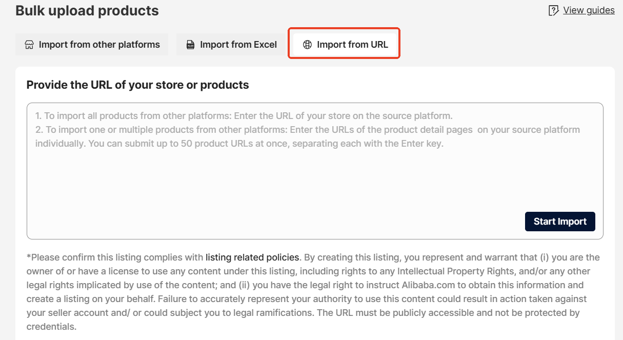 ※最大50件をまとめてインポートすることが可能です。複数製品をまとめてインポートする場合は、URLを入力後にEnterで改行をしてください。 - [Start Import]をクリックします。