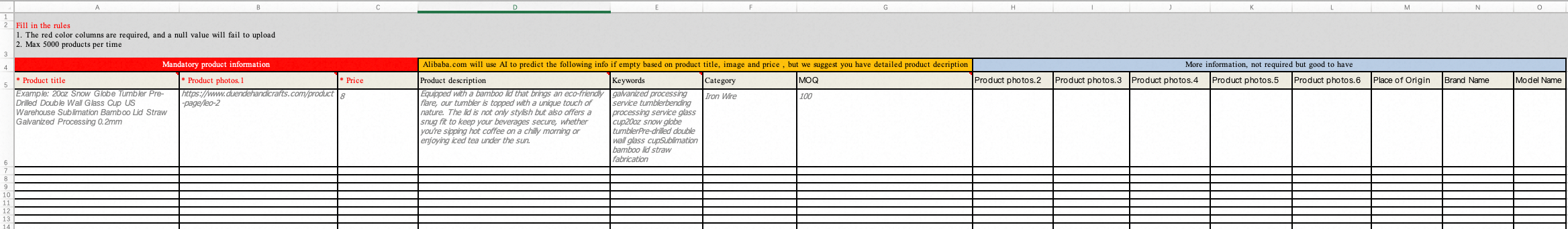 Alibaba.com提供のエクセルフォーマットを利用する場合