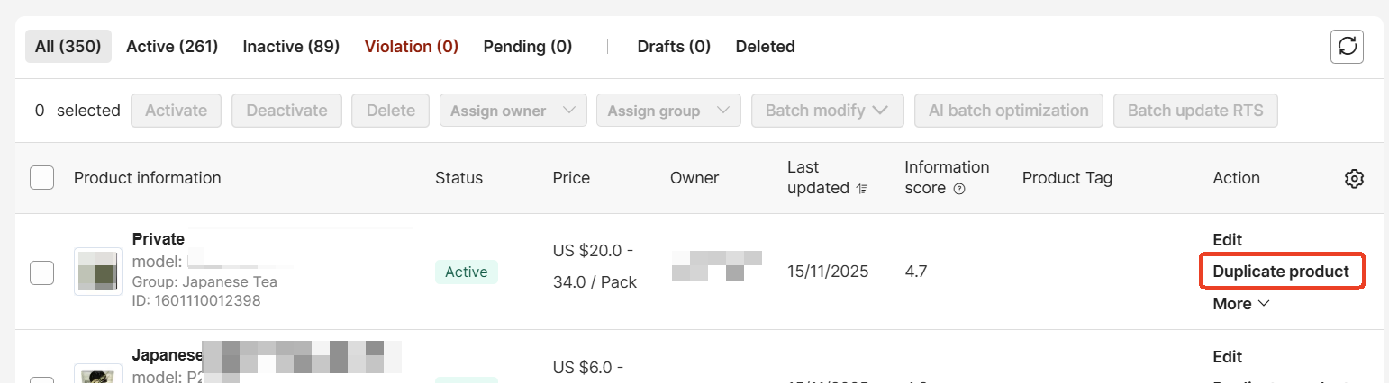 製品一覧からコピーした製品ページの[Duplicate product]をクリックします。