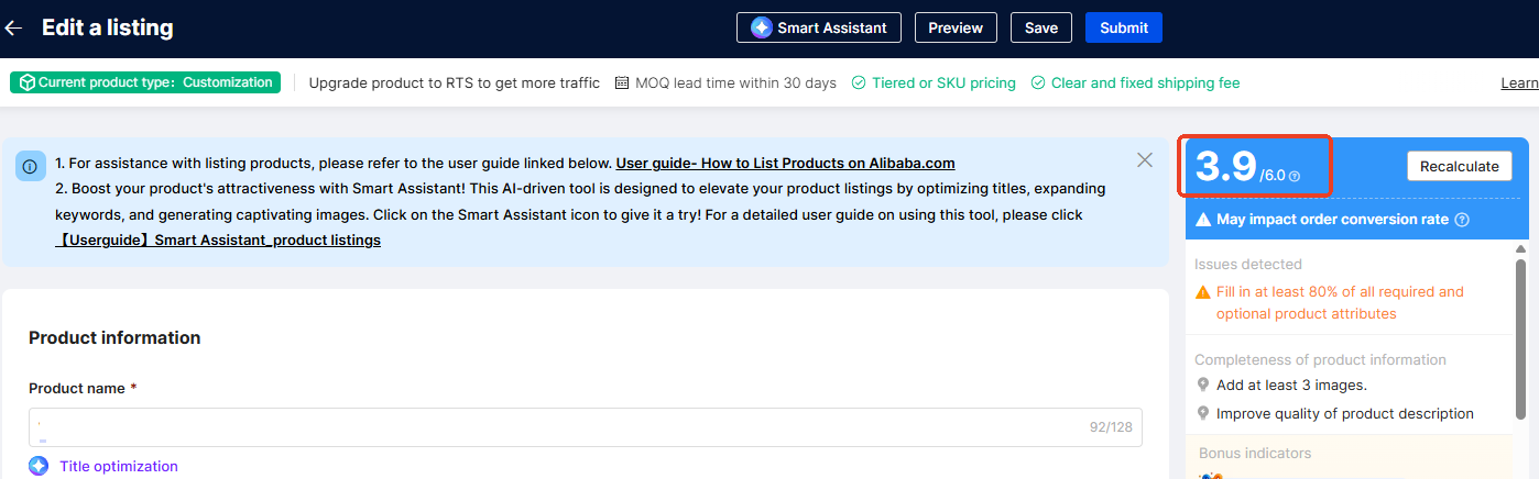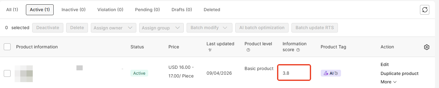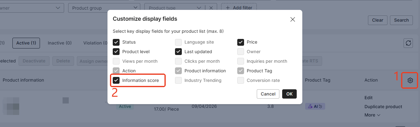 Product Information Score(PIS)はどこで確認できますか? PISは、製品一覧や各製品ページの編集画面にて確認することができます。 ■ 製品ページの編集画面にて確認する ■ 製品一覧で確認する 製品一覧にInformation scoreが表示されていない場合、製品一覧の表示項目設定にて表示させることができます。 製品一覧では、最新のPISが反映されるのにタイムラグがあります。最新のスコアを確認する場合は、製品ページの編集画面よりご確認ください。